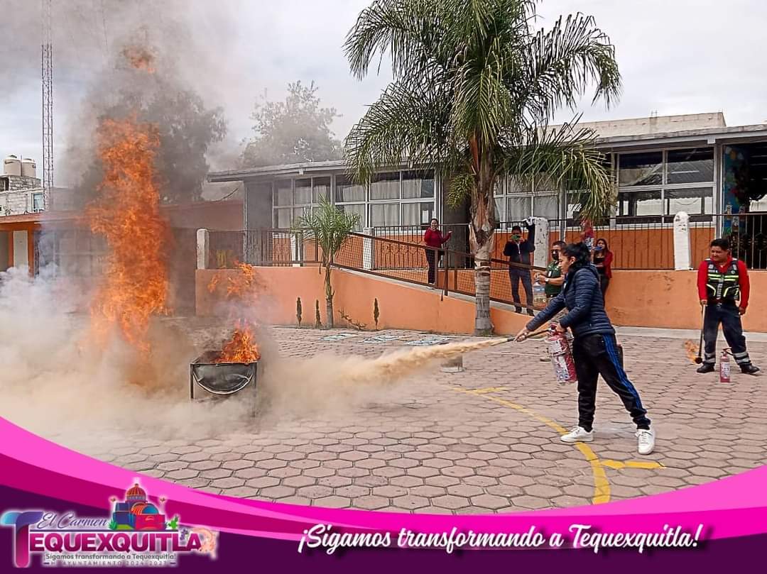 Tequexquitla,Tlaxcala. – Con el objetivo de asegurar un ambiente propicio para el aprendizaje de las y los estudiantes, personal de Protección civil acudió a algunos instituciones del municipio para brindar una capacitación sobre el Uso y manejo de extintores.