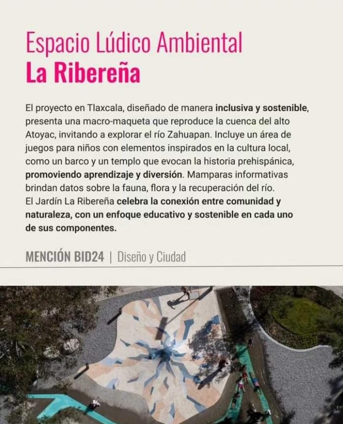 Dentro de lo expuesto en la BID24, resaltó el Espacio Lúdico Ambiental “La Ribereña”, un proyecto en Tlaxcala diseñado de manera inclusiva y sostenible, el cual fue presentado mediante una macro-maqueta que reprodujo la cuenca del Alto Atoyac, invitando a explorar el río Zahuapan.