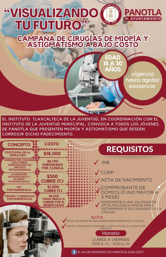 Para acceder a este servicio, los jóvenes interesados deberán acudir a la oficina del Instituto de la Juventud de Panotla, que se encuentra en la casa del abuelo, en un horario de lunes a Viernes, de 9:00 a 17:00 horas, con los siguientes requisitos: INE, CURP, acta de nacimiento y comprobante de domicilio (no mayor a tres meses); más adelante, se someterán a una valoración oftalmológica para determinar si son candidatos a esta cirugía.