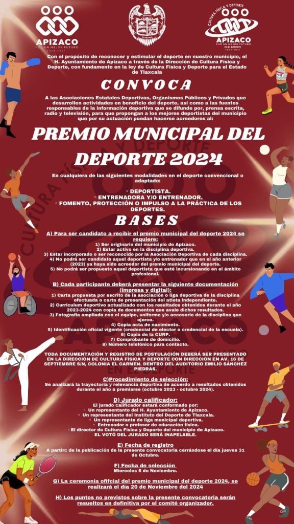 El H. Ayuntamiento de Apizaco y la Dirección de Cultura Física y Deporte, te invitan a postularte para ser candidato a recibir la distinción más importante en el ámbito deportivo: