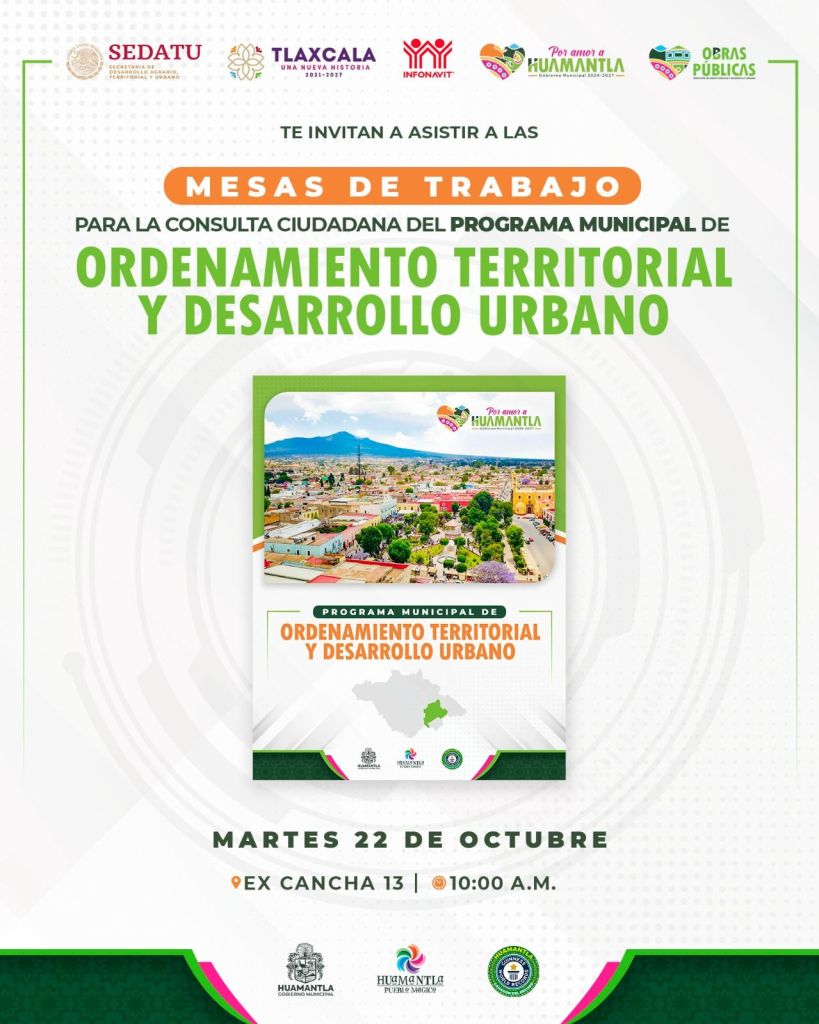 El Ayuntamiento de Huamantla, presidido por Salvador Santos Cedillo, a través de la Dirección de Obras Públicas y Desarrollo Urbano, invita a toda la ciudadanía a participar en las mesas de trabajo del Programa Municipal de Ordenamiento Territorial y Desarrollo Urbano, que se llevarán a cabo este martes 22 de octubre, a las 10:00 horas en el Auditorio de la Ex Cancha Trece.