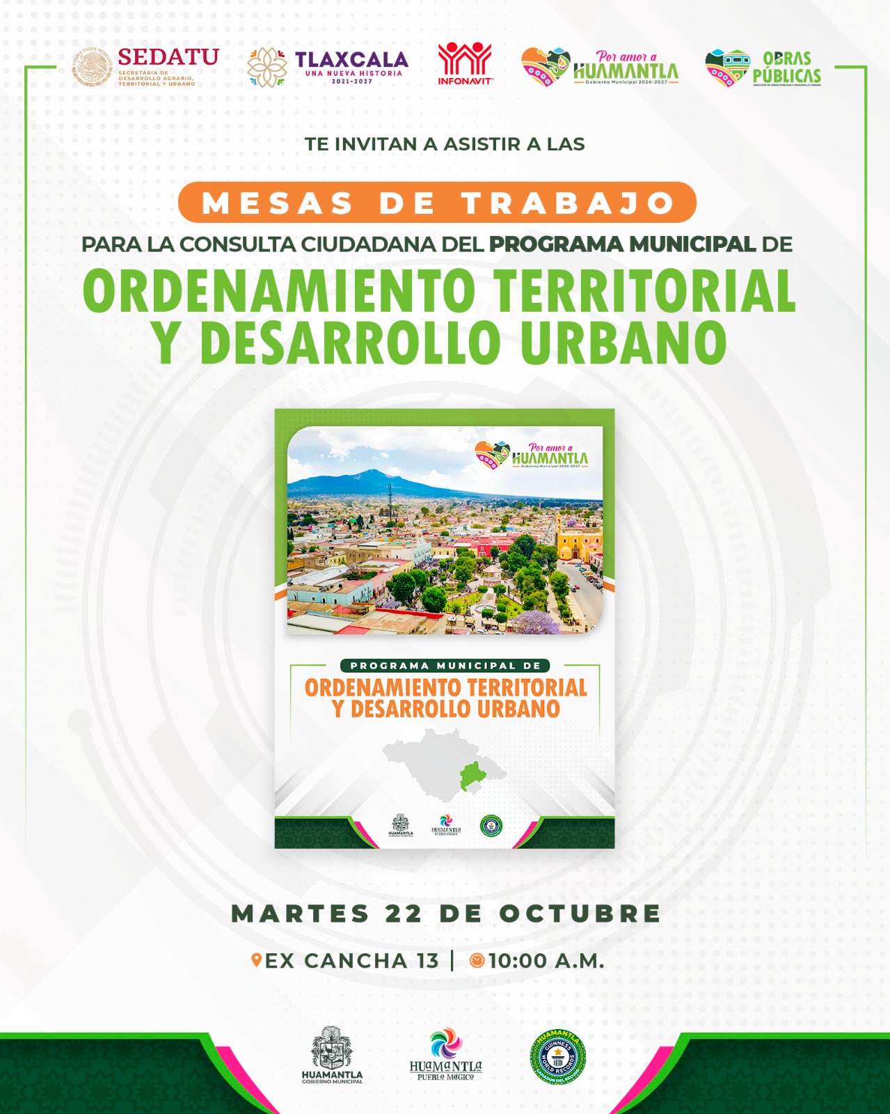 El Ayuntamiento de Huamantla, presidido por Salvador Santos Cedillo, a través de la Dirección de Obras Públicas y Desarrollo Urbano, invita a toda la ciudadanía a participar en las mesas de trabajo del Programa Municipal de Ordenamiento Territorial y Desarrollo Urbano, que se llevarán a cabo este martes 22 de octubre, a las 10:00 horas en el Auditorio de la Ex Cancha Trece.