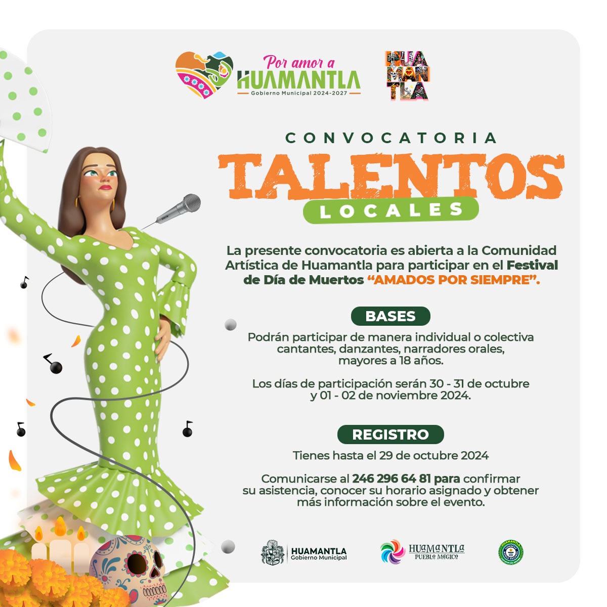 El Gobierno Municipal de Huamantla, a través de la Coordinación de Cultura, anuncia la apertura de la convocatoria dirigida a talentos locales que deseen participar en el festival del Día de Muertos “Amados por Siempre”, evento que tiene como objetivo principal fomentar la expresión artística en el Pueblo Mágico.
