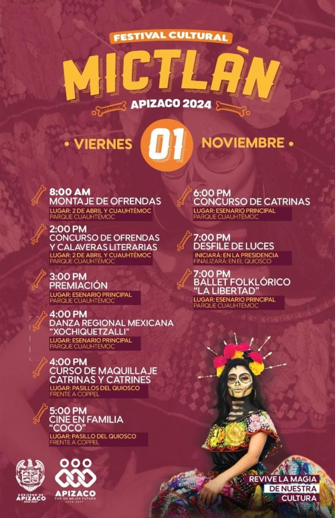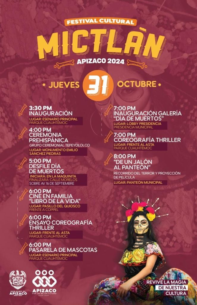 El H. Ayuntamiento de Apizaco, encabezado por Javier Rivera Bonilla, en colaboración con la Coordinación de Cultura, invitan al Festival Cultural Mictlán Apizaco 2024 que se llevará a cabo el jueves 31 de octubre y viernes 01 de noviembre.