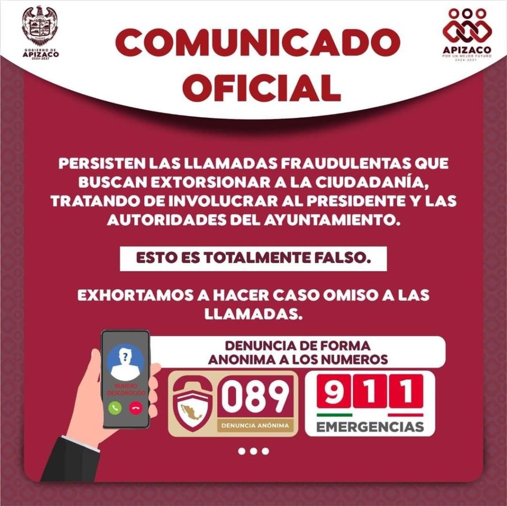 Si recibes una llamada sospechosa con información que pueda involucrar al presidente y/o autoridades del H. Ayuntamiento de #Apizaco ¡No caigas!