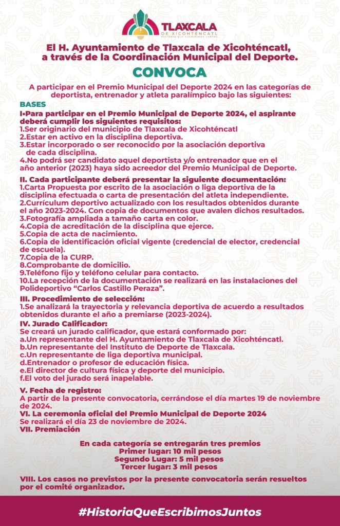 El Ayuntamiento de Tlaxcala de Xicohténcatl extiende la invitación a todos los deportistas, entrenadores y público en general que practiquen y promuevan el deporte en el municipio, a participar en el Premio Municipal del Deporte 2024.