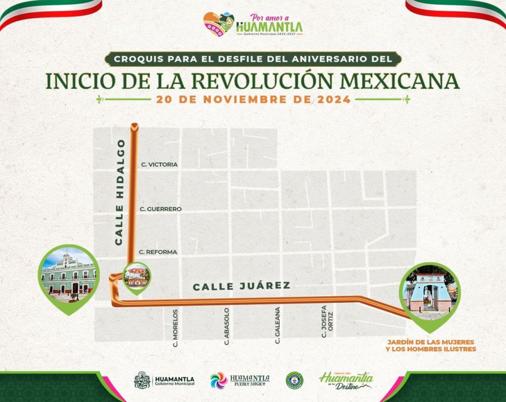 El Gobierno Municipal de Huamantla informa que, con motivo del desfile por el 114 Aniversario de la Revolución Mexicana, este miércoles 20 de noviembre habrá cierre de calles y desvíos en la circulación vehicular y peatonal en el centro de la ciudad.