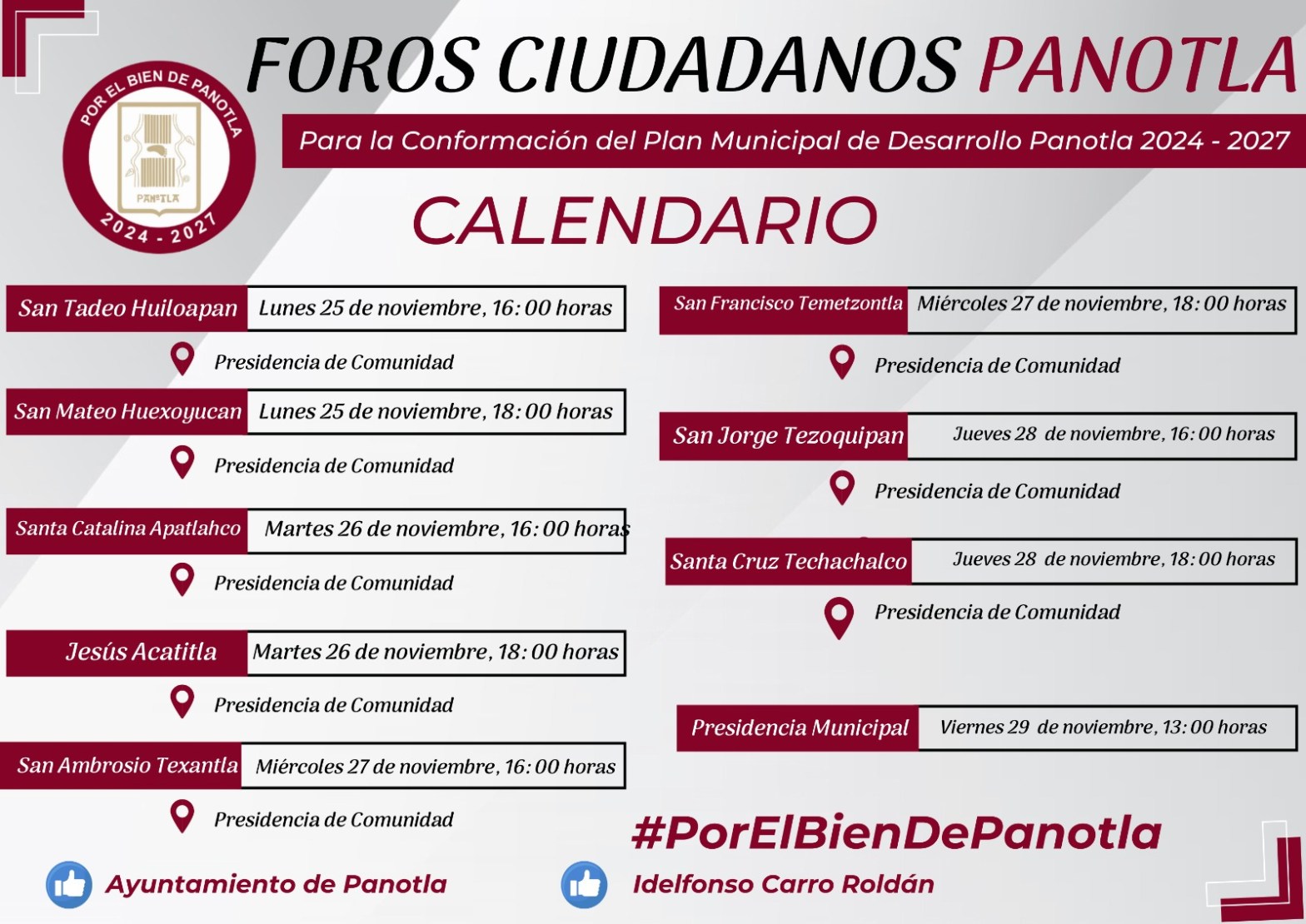 El inicio de estos foros será el próximo lunes 25 de noviembre en San Tadeo Huilopan y San Mateo Huexoyucan, posteriormente, el martes 26 de noviembre serán en Santa Catalina Apatlahco y Jesús Acatitla, el miércoles 27 de noviembre en San Ambrosio Texantla y San Francisco Temetzontla, el jueves 28 de noviembre en San Jorge Tezoquipan, Santa Cruz Techachalco y para finalizar estos foros ciudadanos será el viernes 29 de noviembre en la cabecera municipal.