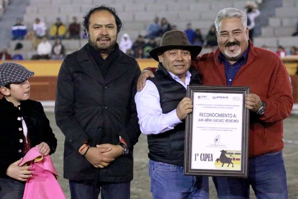 El Alcalde Javier Rivera, el matador José Luis Angelino Director del ITDT y el titular de la Coordinación Taurina Municipal Lázaro Rosas otorgaron reconocimientos al ganadero de La Gasca Juan Carlos González Necoechea, al apoderado Esteban García y al maestro de la Escuela Taurina Municipal de Apizaco Jesús Villanueva.
