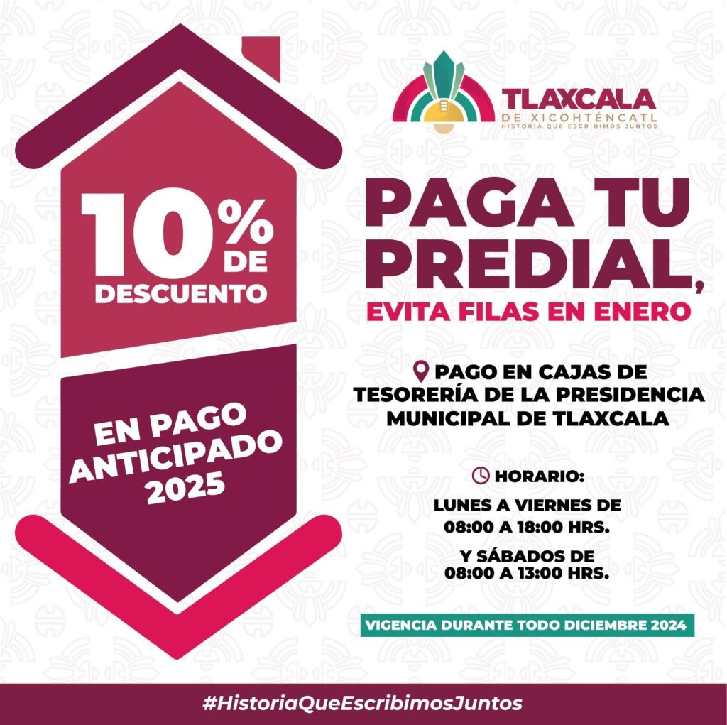 En apoyo a la economía de las familias del municipio, el Ayuntamiento de Tlaxcala de Xicohténcatl, encabezado por el presidente municipal Alfonso Sánchez, pone en marcha la campaña de descuentos en el pago anticipado del impuesto predial 2025.