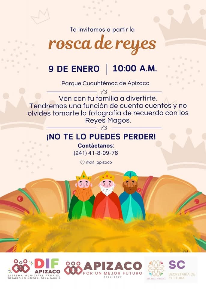 Únete a nosotros este 09 de enero a las 10:00 AM en el Parque de Apizaco para disfrutar de un día lleno de magia, sorpresas y diversión. Habrá actividades para toda la familia y por supuesto, ¡la tradicional rosca de Reyes!