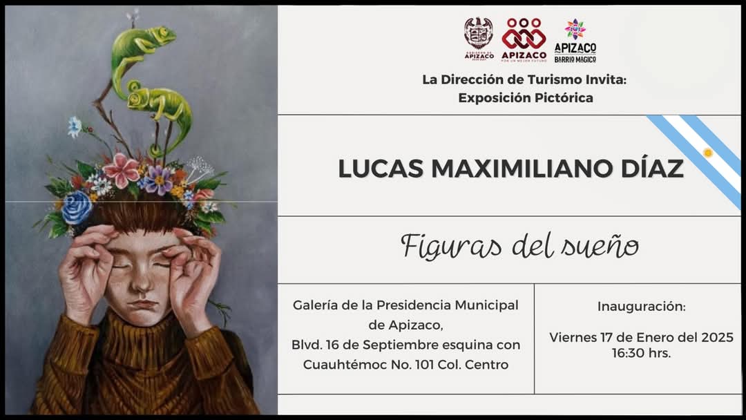 🖌️Te invitamos a la Exposición Pictórica titulada «Figura del Sueño» por Lucas Maximiliano Díaz el día 17 de enero a las 16:30pm en nuestra Presidencial Municipal de Apizaco.🎨✨
