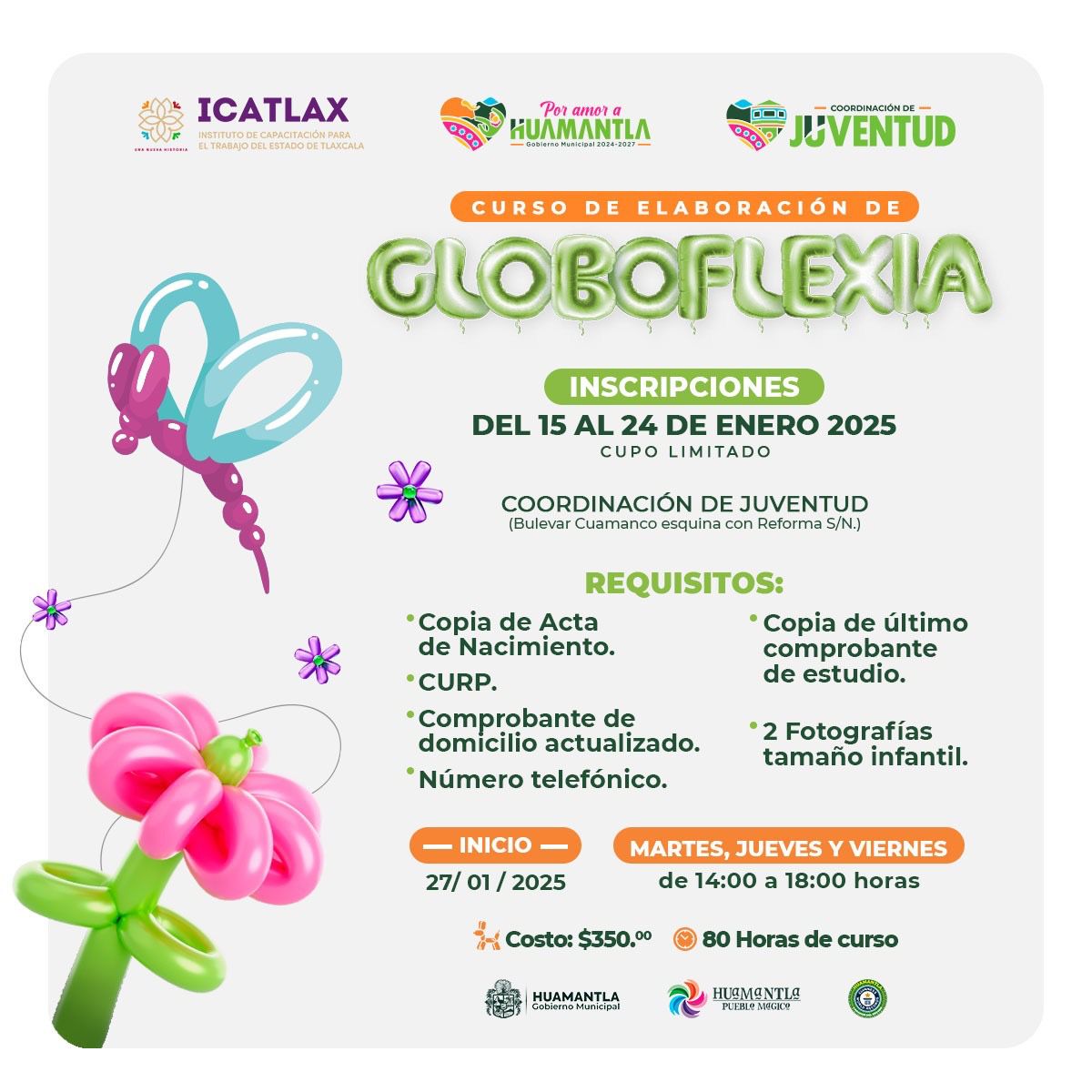 La Coordinación de Juventud de Huamantla, en colaboración con el Instituto de Capacitación para el Trabajo del Estado de Tlaxcala (Icatlax), invita a todos los jóvenes del municipio a inscribirse en el curso de Globoflexia, que iniciará el próximo 27 de enero.