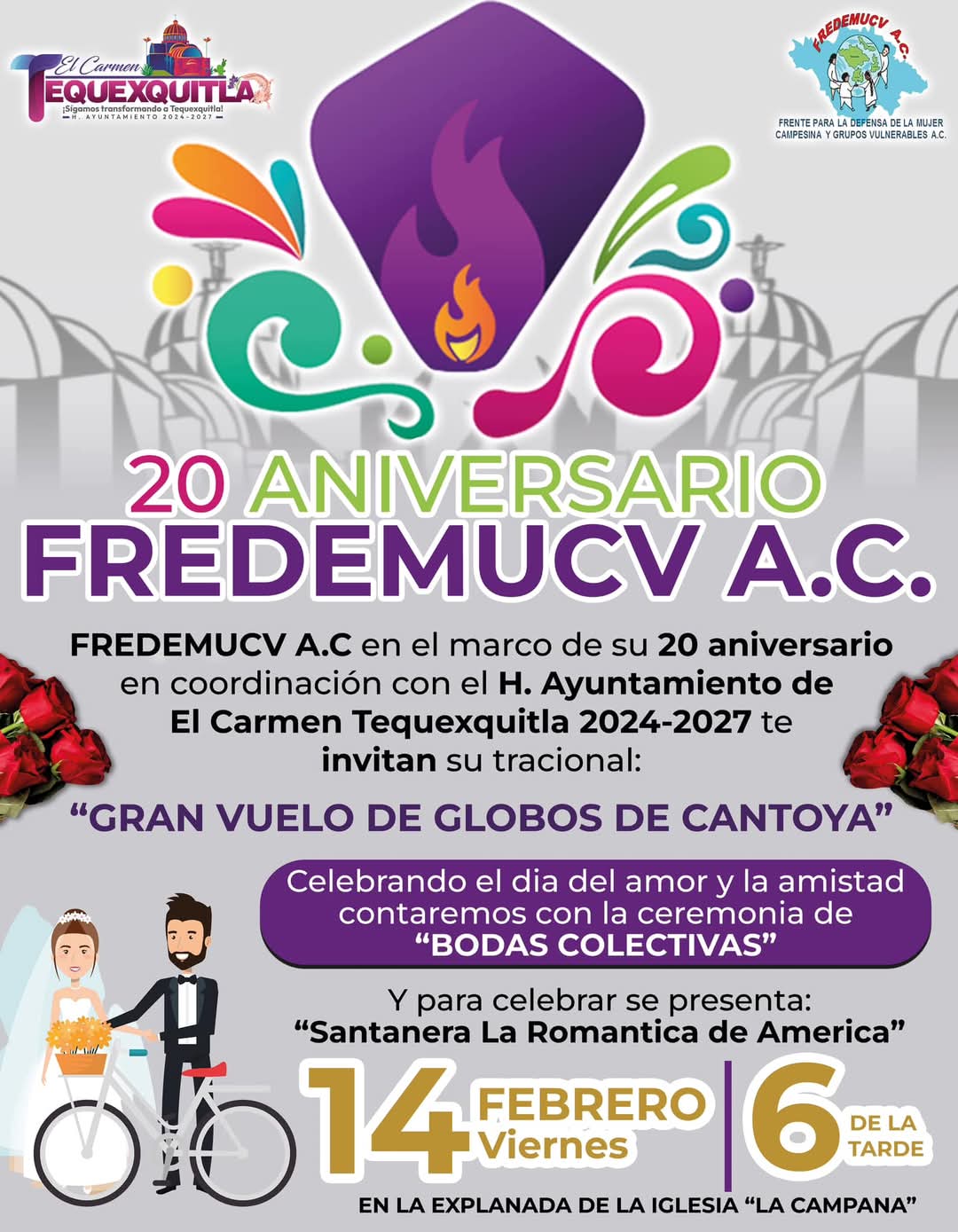 La asociación FREDEMUCV A.C. en el marco de su 20 aniversario en coordinación con el Gobierno Municipal de El Carmen Tequexquitla 2024-2027 te invitan a celebrar el día del amor y la amistad con su tradicional » VUELO DE GLOBOS DE CANTOYA» 🕯️🎈♥️💑