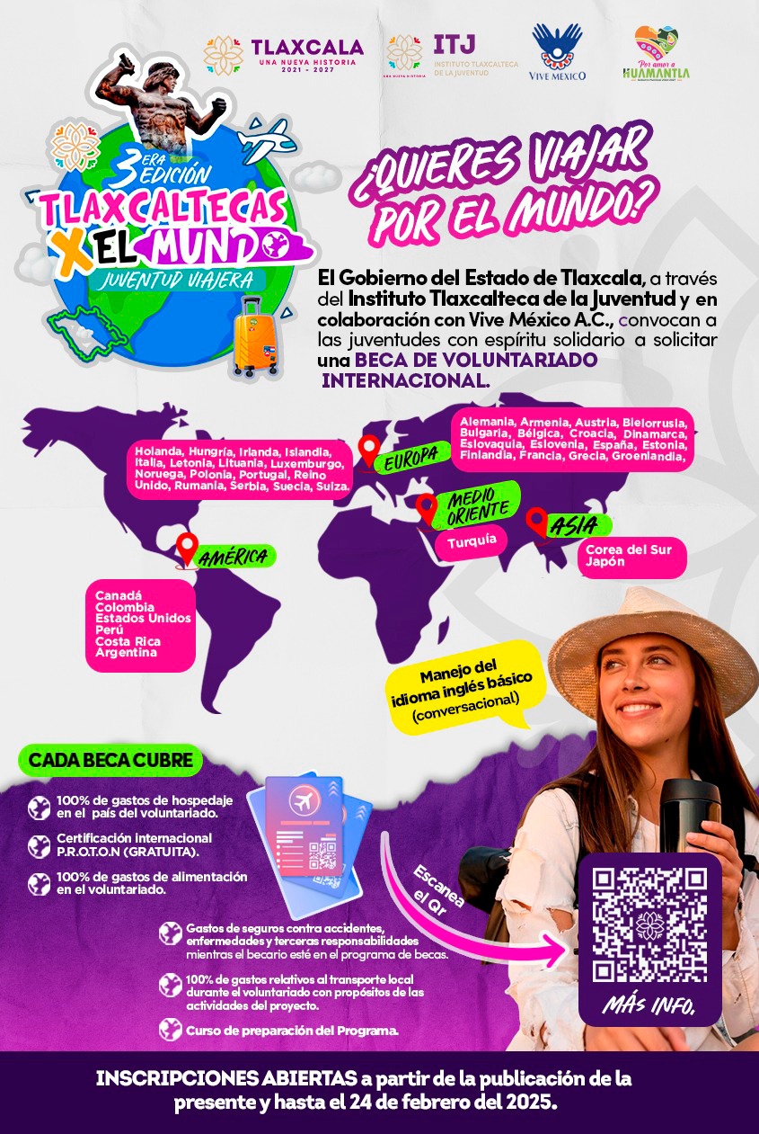 El Gobierno de Huamantla, en colaboración con el Instituto Tlaxcalteca de la Juventud (ITJ) y “Vive México” A.C., invita a los jóvenes del municipio a participar en la tercera edición de «Tlaxcaltecas Por El Mundo, Juventud Viajera», una iniciativa que impulsa la educación internacional a través de experiencias de voluntariado en el extranjero.