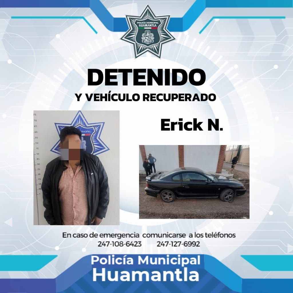 Como resultado de los operativos permanentes de vigilancia, la Policía Municipal de Huamantla logró la detención de Erick «N», presunto responsable del robo de un automóvil marca Ford, tipo Mustang.