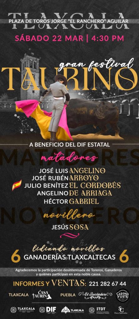 El sábado 22 de Marzo a las 4:30 en la Plaza Jorge Aguilar «El Ranchero» de Tlaxcala, capital, partirán plaza los matadores José Luis Angelino, José Rubén Arroyo, el español Julio Benítez «El Cordobés», Angelino de Arriaga, Héctor Gabriel y el Novillero Jesús Sosa para lidiar 6 Novillos-Toros de prestigiadas ganaderías Tlaxcaltecas.