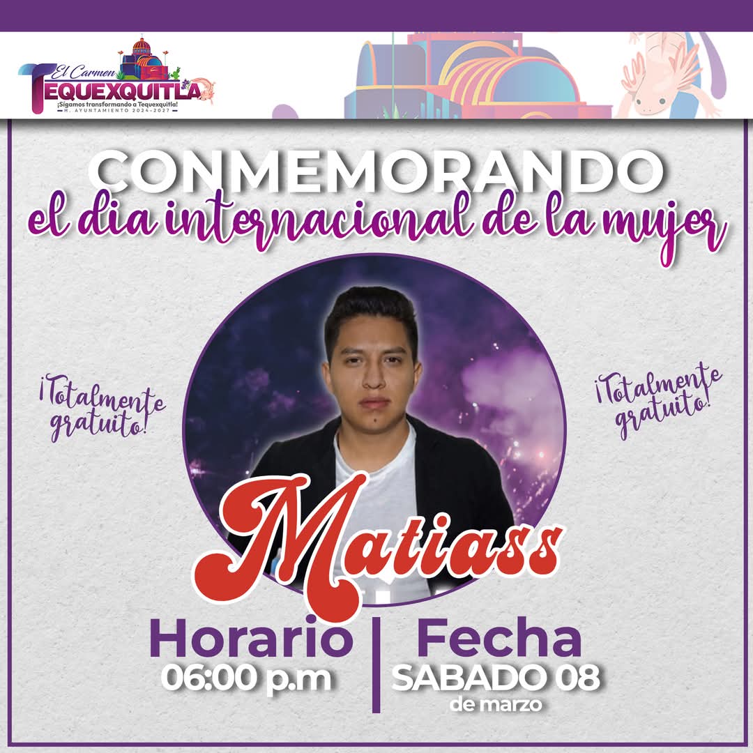 El Gobierno Municipal se complace en anunciar que, en conmemoración del Día Internacional de la Mujer, se presentará Matiass en un evento especial 🎤.
