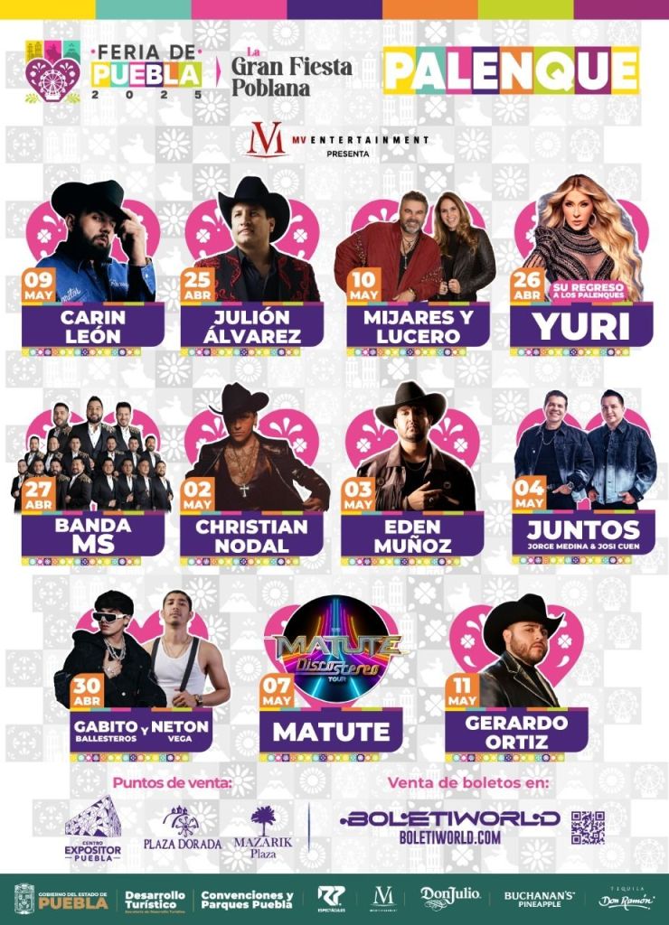 El cartel del Palenque de la Feria de Puebla 2025 es el siguiente: el 25 abril se presentará Julión Álvarez; sábado 26 de abril, Yuri; domingo 27 de abril, Banda MS; el miércoles 30 abril, Gabito Ballesteros y Neto Vega.