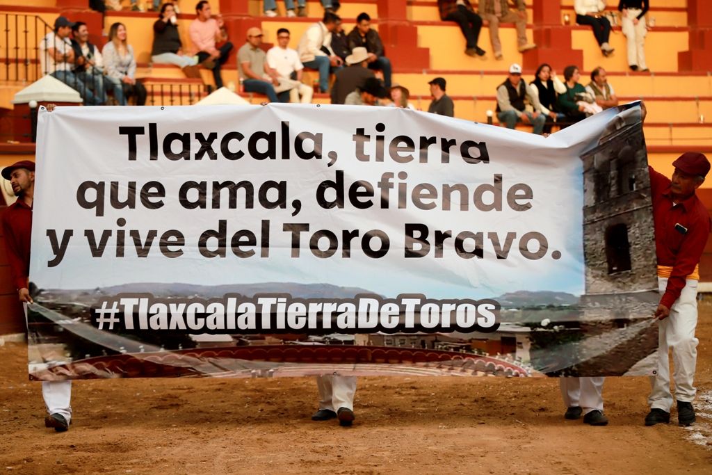 A la mitad del festejo entre aplausos los toreros dieron vuelta al ruedo tras una manta que expresaba la importancia de la afición a los toros en este Estado.