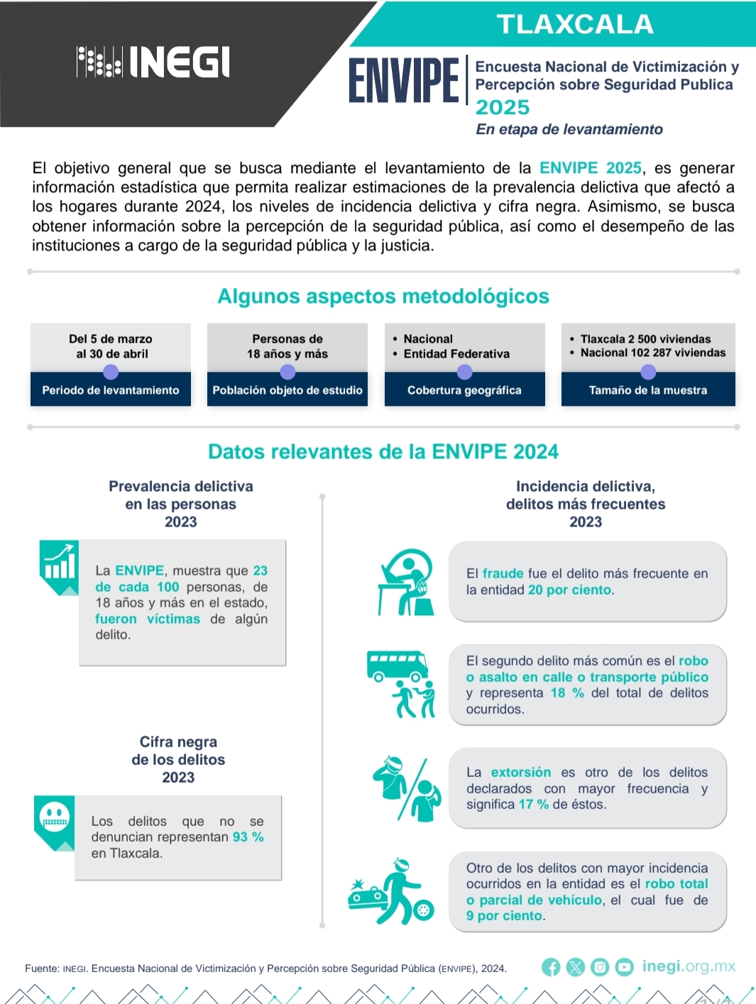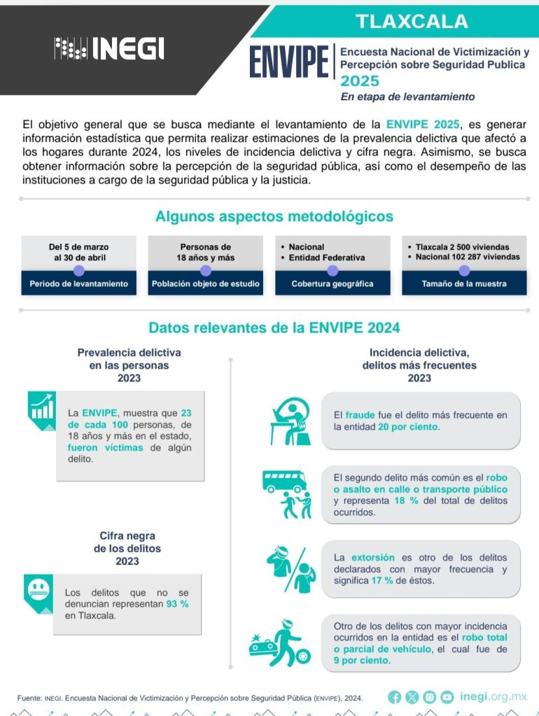 El Gobierno Municipal de Huamantla y el Instituto Nacional de Estadística y Geografía (INEGI), a través de la Coordinación Estatal de Tlaxcala, informan que desde este mes y hasta el 30 de abril se llevará a cabo la Encuesta Nacional de Victimización y Percepción sobre Seguridad Pública 2025 (ENVIPE).