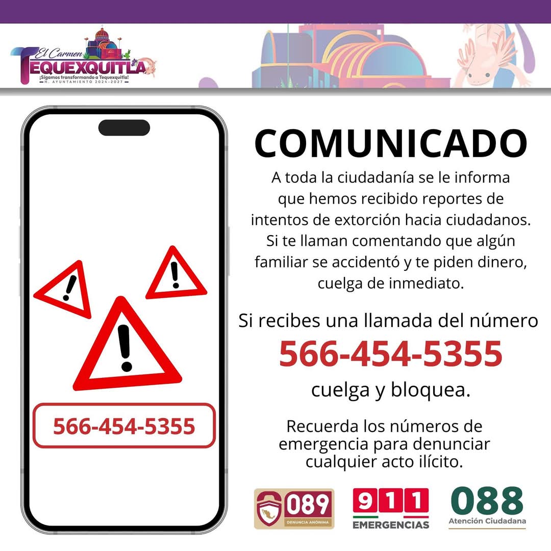 El gobierno municipal de Tequexquitla te informa que ha habido reportes de extorsión a ciudadanos a través de llamadas telefónicas fraudulentas 📞.
