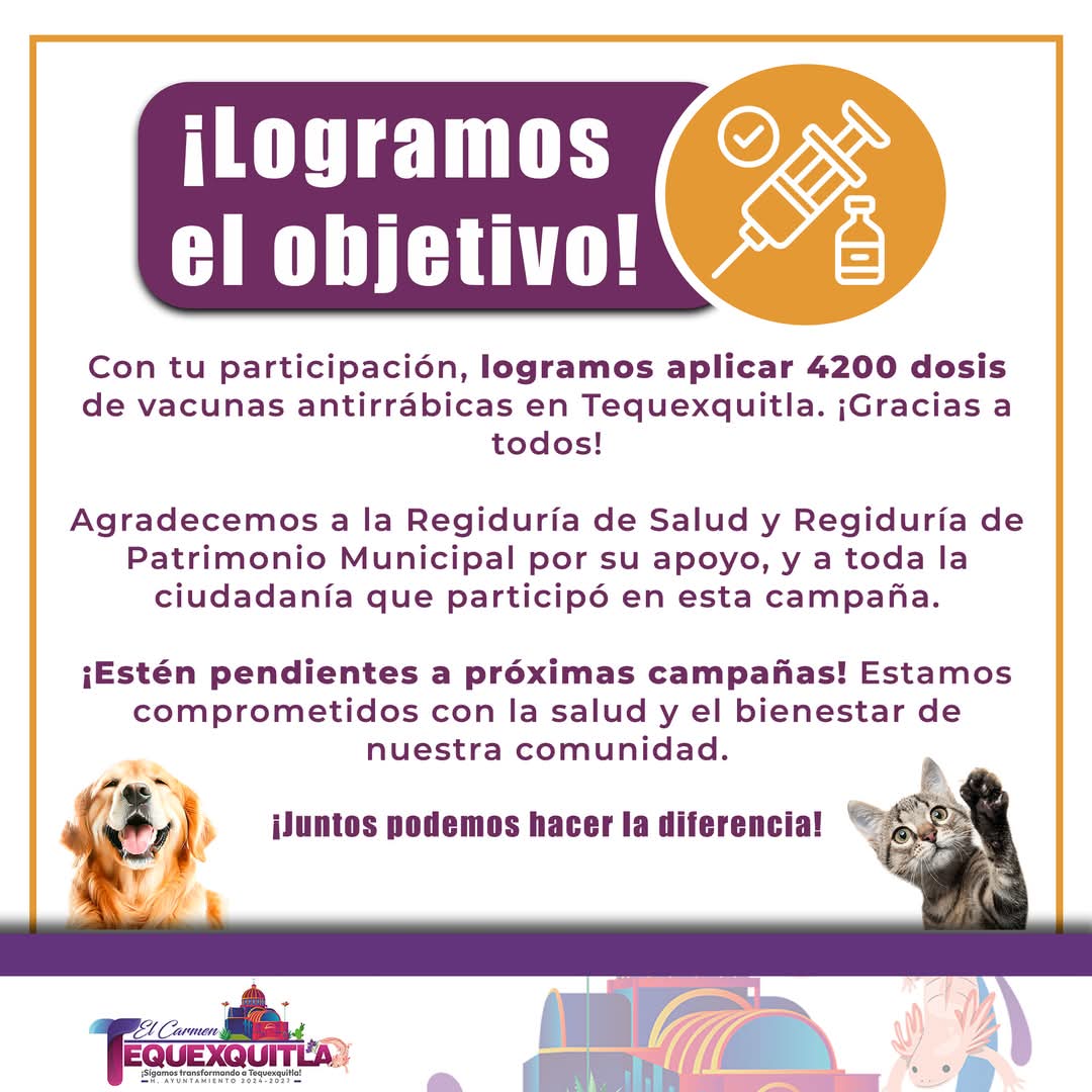 Con gran satisfacción, anunciamos que hemos alcanzado nuestra meta de aplicar 4200 dosis de vacunas antirrábicas en Tequexquitla 🌟. Esto no hubiera sido posible sin la participación activa de nuestra comunidad 👥.