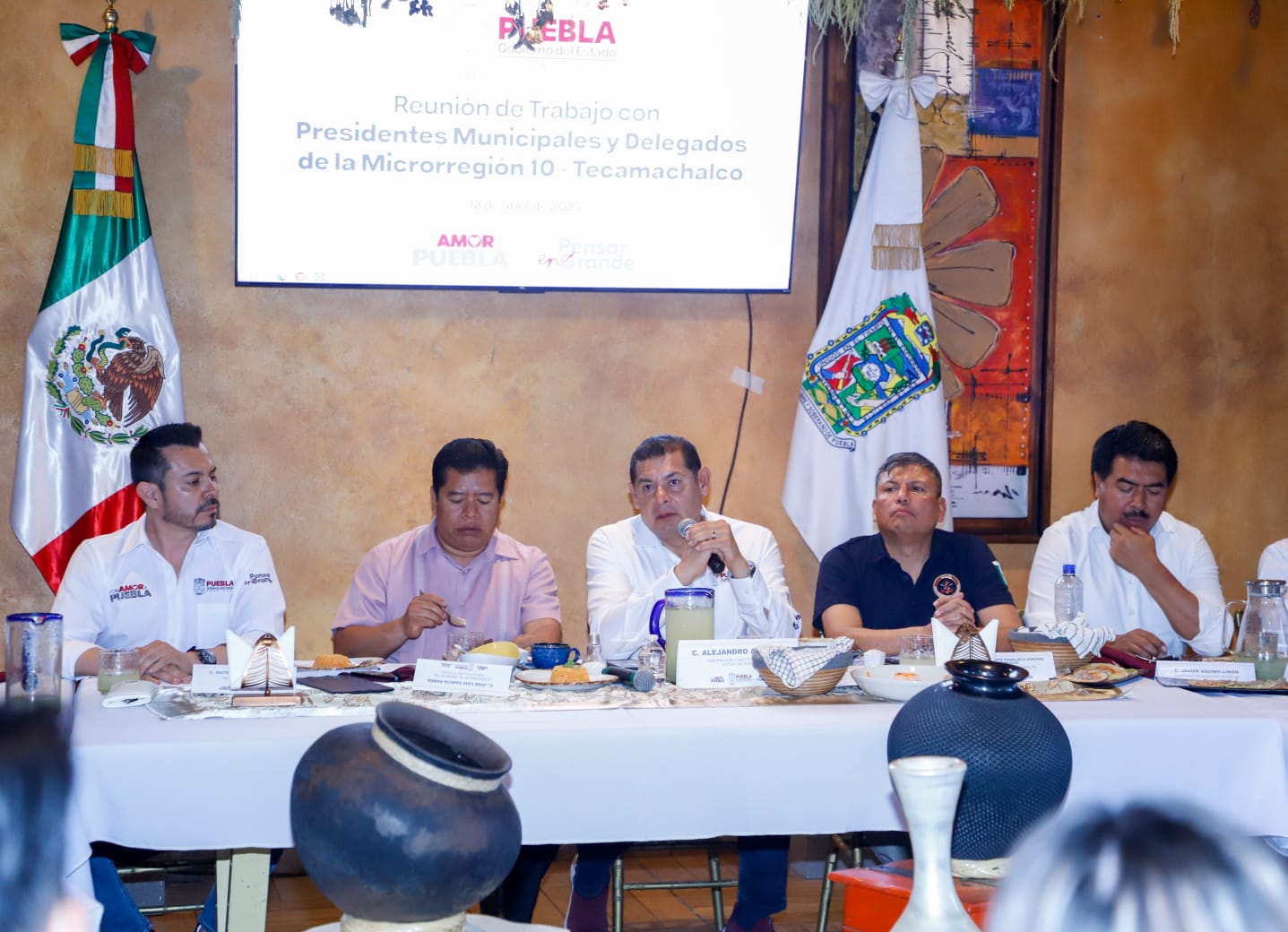 TECAMACHALCO, Pue.- Durante su gira de trabajo el gobernador del Estado, Alejandro Armenta encabezó una mesa de trabajo en la que participaron presidentas, presidentes municipales y delegados de la microrregión 10 con el objetivo de orientar el desempeño de los municipios a generar desarrollo y bienestar comunitario.