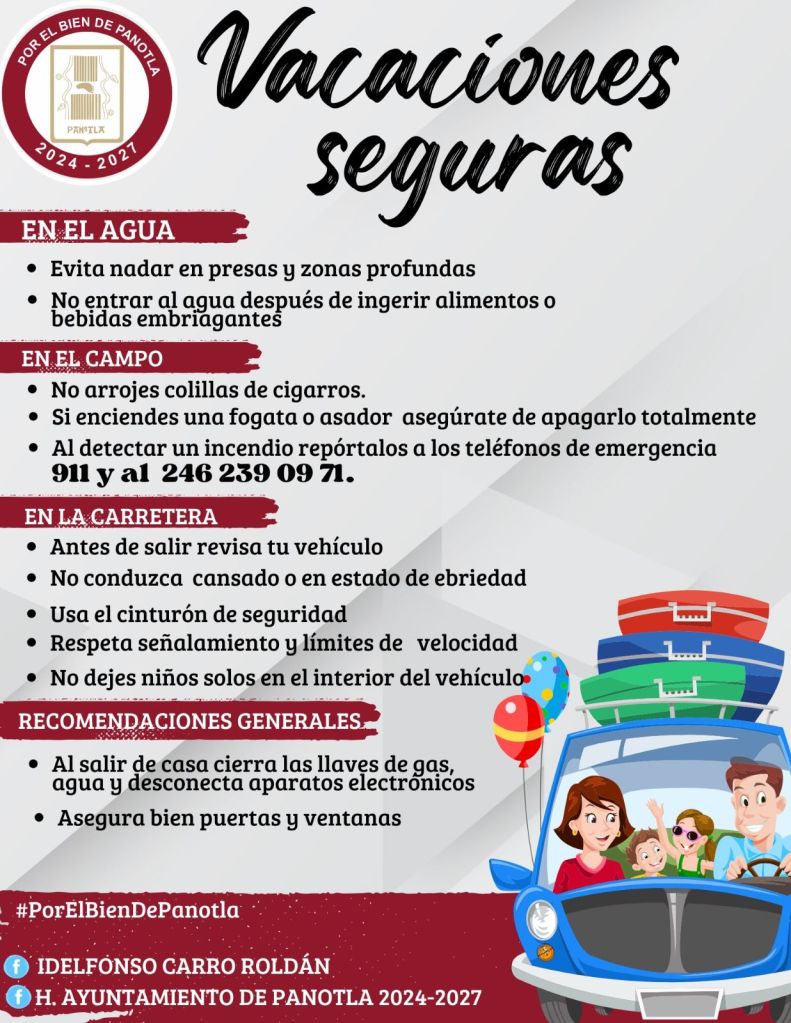 El Ayuntamiento de Panotla, encabezado por el presidente municipal Idelfonso Carro Roldán, a través de la Dirección de Salud, Protección Civil municipal y Seguridad, hace un llamado a la ciudadanía a mantener una actitud responsable y prevenir riesgos que pongan en peligro la salud, la seguridad o la integridad de las familias panotlenses.