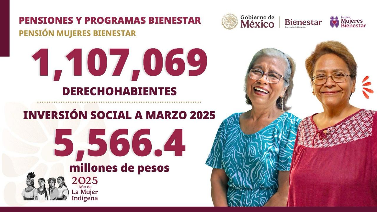 Durante la conferencia matutina: “Las mañaneras del pueblo”, que encabeza la Presidenta Claudia Sheinbaum Pardo, la secretaria de Bienestar, Ariadna Montiel Reyes, informó que un millón 107 mil 69 derechohabientes de 63 y 64 años ya reciben la Pensión Mujeres Bienestar en todo el país, a través de una inversión a marzo de 2025 de 5 mil 566.4 millones de pesos a marzo de 2025.