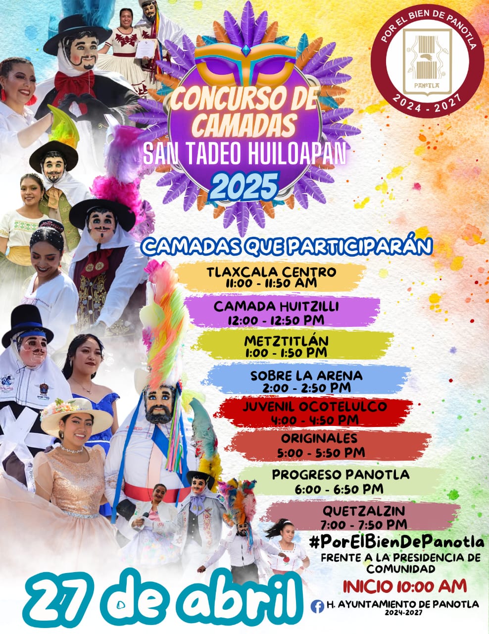 El Ayuntamiento de Panotla, que encabeza el presidente municipal Idelfonso Carro Roldán, en coordinación con la Comunidad de San Tadeo Huiloapan, tiene el honor de invitar a toda la ciudadanía al tradicional Concurso de Camadas 2025, evento que se llevará a cabo el próximo domingo 27 de abril, a partir de las 10:00 horas, frente a la presidencia de comunidad.
