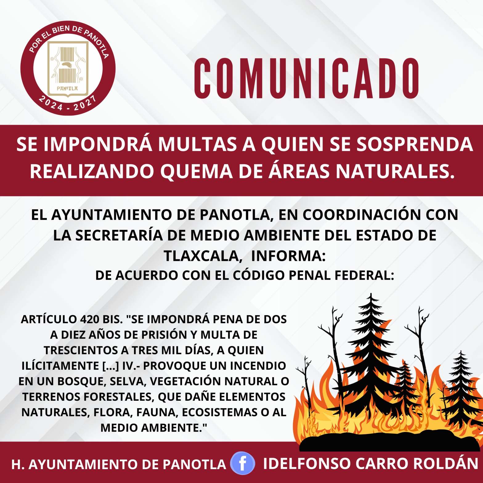 El Ayuntamiento de Panotla, encabezado por el Presidente Municipal Idelfonso Carro Roldán, en coordinación con la Secretaría de Medio Ambiente del Estado de Tlaxcala, informa a toda la población que queda estrictamente prohibida la quema de pastizales, debido al grave riesgo que representa para la salud, la seguridad pública y el medio ambiente.