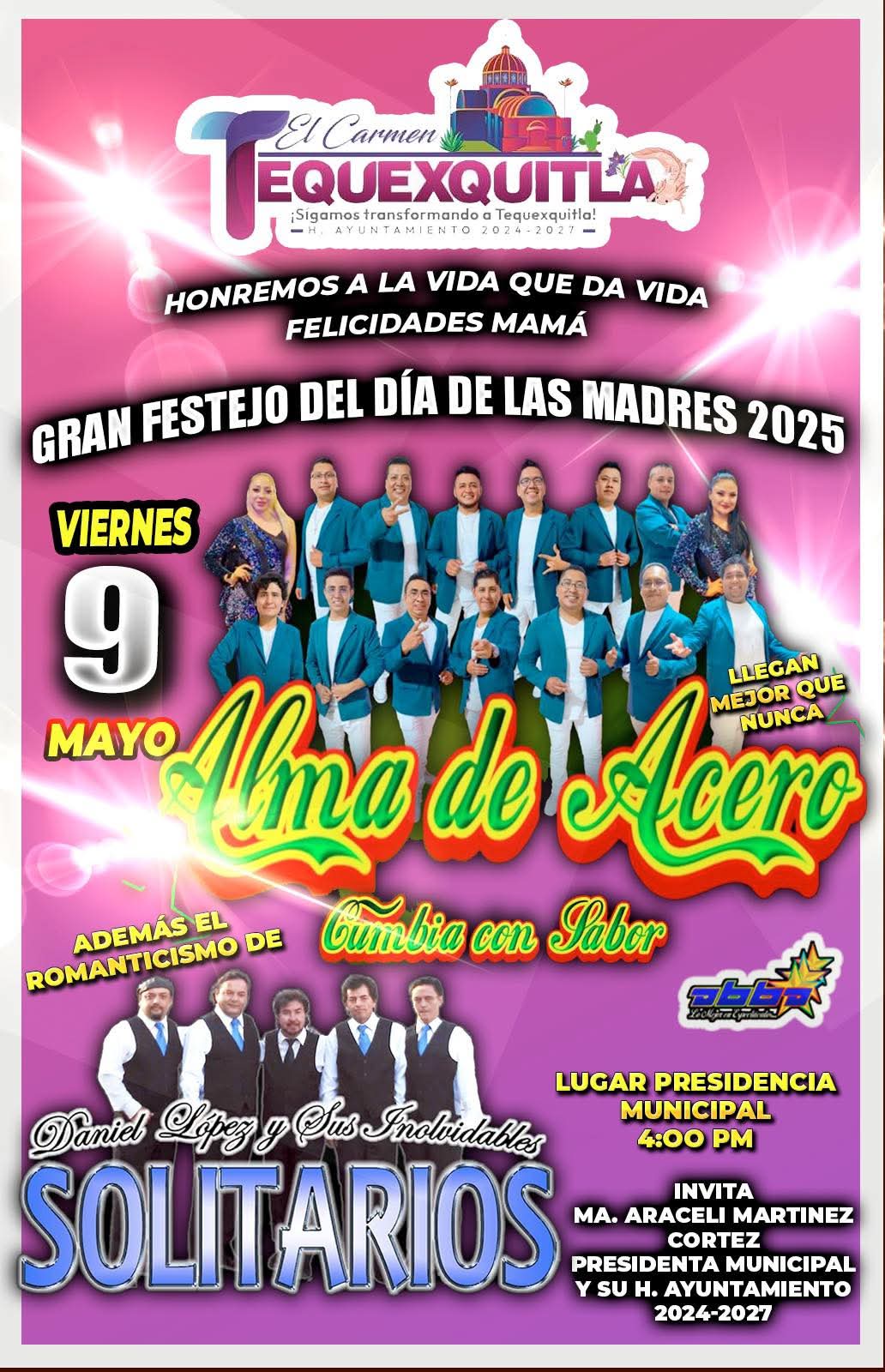 Este viernes 9 de mayo, a partir de las 4:00 pm, en la Presidencia Municipal 🏛️, se llevará a cabo un evento inolvidable con la presentación estelar de Alma de Acero 🎸 y Daniel López y sus Inolvidables Solitarios 🎶.