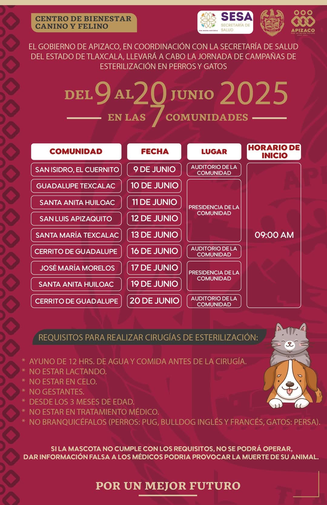 El H.Ayuntamiento de Apizaco, en coordinación con la Secretaría de Salud de Tlaxcala, llevaremos a cabo una campaña de esterilización para perros y gatos del 9 al 20 de junio de 2025 en las 7 comunidades de nuestro municipio.
