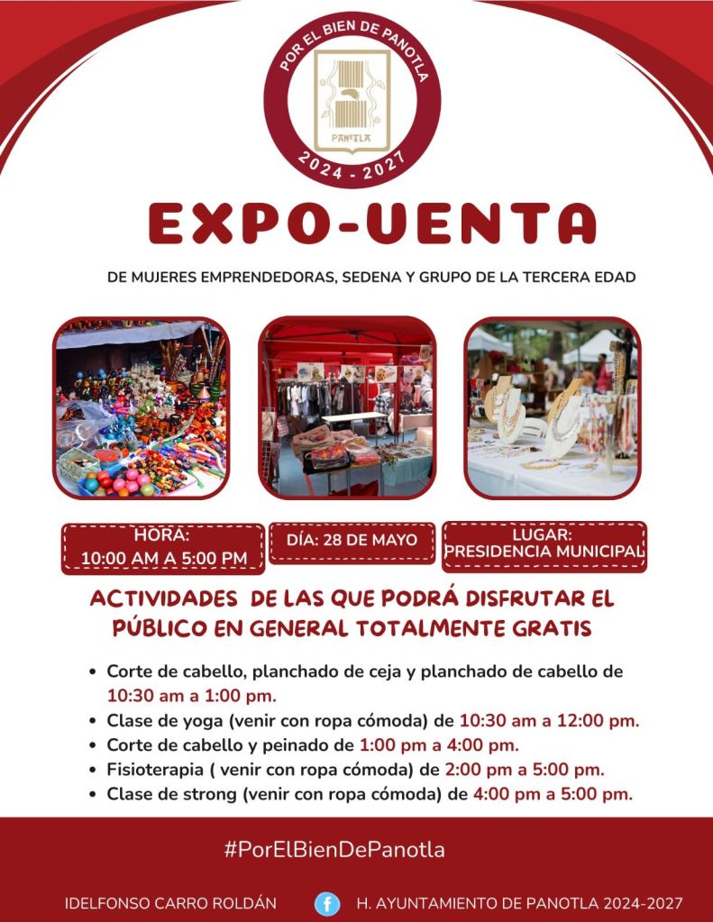 El H. Ayuntamiento de Panotla 2024–2027, que encabeza el presidente municipal Idelfonso Carro Roldán, invita a la ciudadanía a participar en la Expo-Venta que se llevará a cabo este 28 de mayo en la explanada de la Presidencia Municipal, en un horario de 10:00 a.m. a 5:00 p.m.