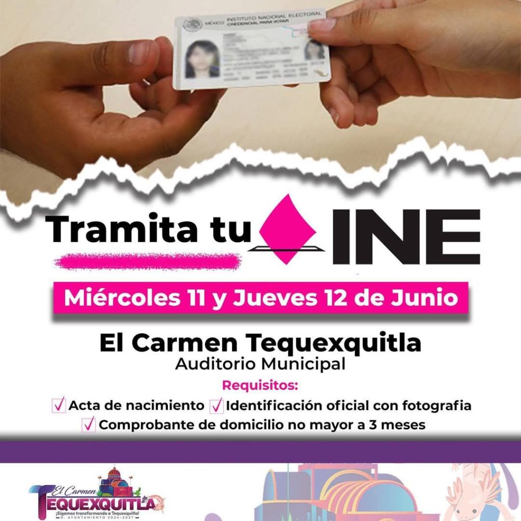 El Gobierno Municipal de El Carmen Tequexquitla 2024 – 2027 informa a toda la población en general que el módulo de atención ciudadana (INE) estará en Tequexquitla. 🤝🏻