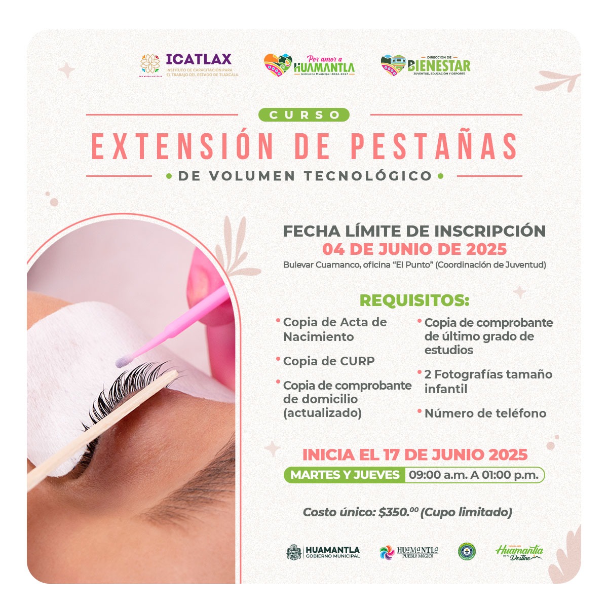 Como una forma de generar oportunidades de autoempleo para la ciudadanía, el Gobierno Municipal de Huamantla, que encabeza Salvador Santos Cedillo, en coordinación con el Instituto de Capacitación para el Trabajo del Estado de Tlaxcala (ICATLAX), invita a la población interesada a participar en el curso «Extensión de Pestañas de Volumen Tecnológico», el cual iniciará el próximo 17 de junio.