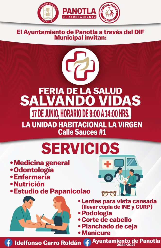 El Ayuntamiento de Panotla 2024–2027, encabezado por el presidente municipal Idelfonso Carro Roldán, a través del Sistema DIF Municipal, invita cordialmente a la población a participar en la Feria de la Salud “Salvando Vidas”, una jornada médica y de bienestar pensada para el cuidado integral de las familias del municipio.