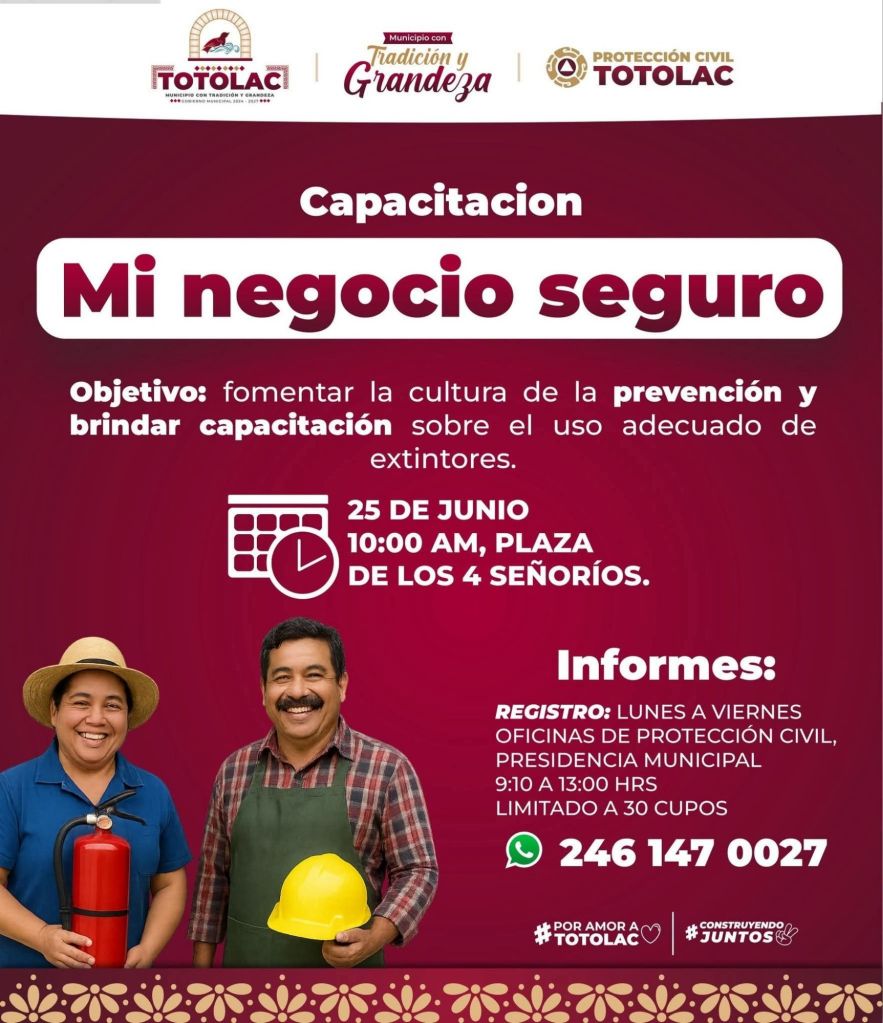 El Gobierno Municipal de Totolac 24-27 a través de la Dirección de Protección Civil invita a los locatarios a participar en la capacitación «𝗠𝗶 𝗡𝗲𝗴𝗼𝗰𝗶𝗼 𝗦𝗲𝗴𝘂𝗿𝗼».