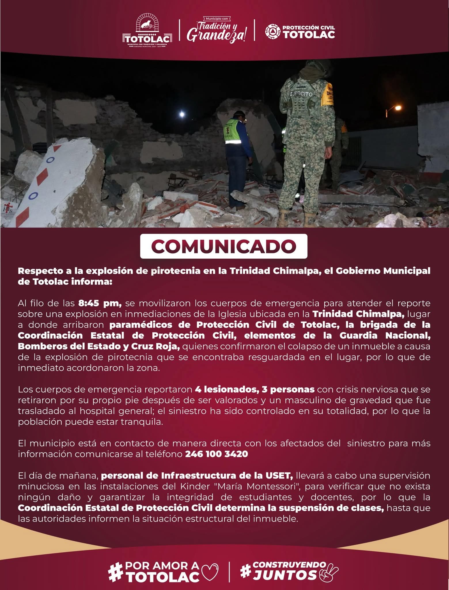 ¡COMUNICADO 👇👀! EXPLOSIÓN LA TRINIDAD CHIMALPA, TOTOLAC Publicado porEXPRESION17 de junio de 2025Publicado en Edo Tlaxcala, Nacional, Noticias, Seguridad, Tlaxcala 16 DE JUNIO 2025 Gobierno Municipal de Totolac 24-27Benjamín Atonal Conde Comparte esto: Haz clic para compartir en X (Se abre en una ventana nueva) X Haz clic para compartir en Facebook (Se abre en una ventana nueva) Facebook Me gusta Cargando... Relacionado
