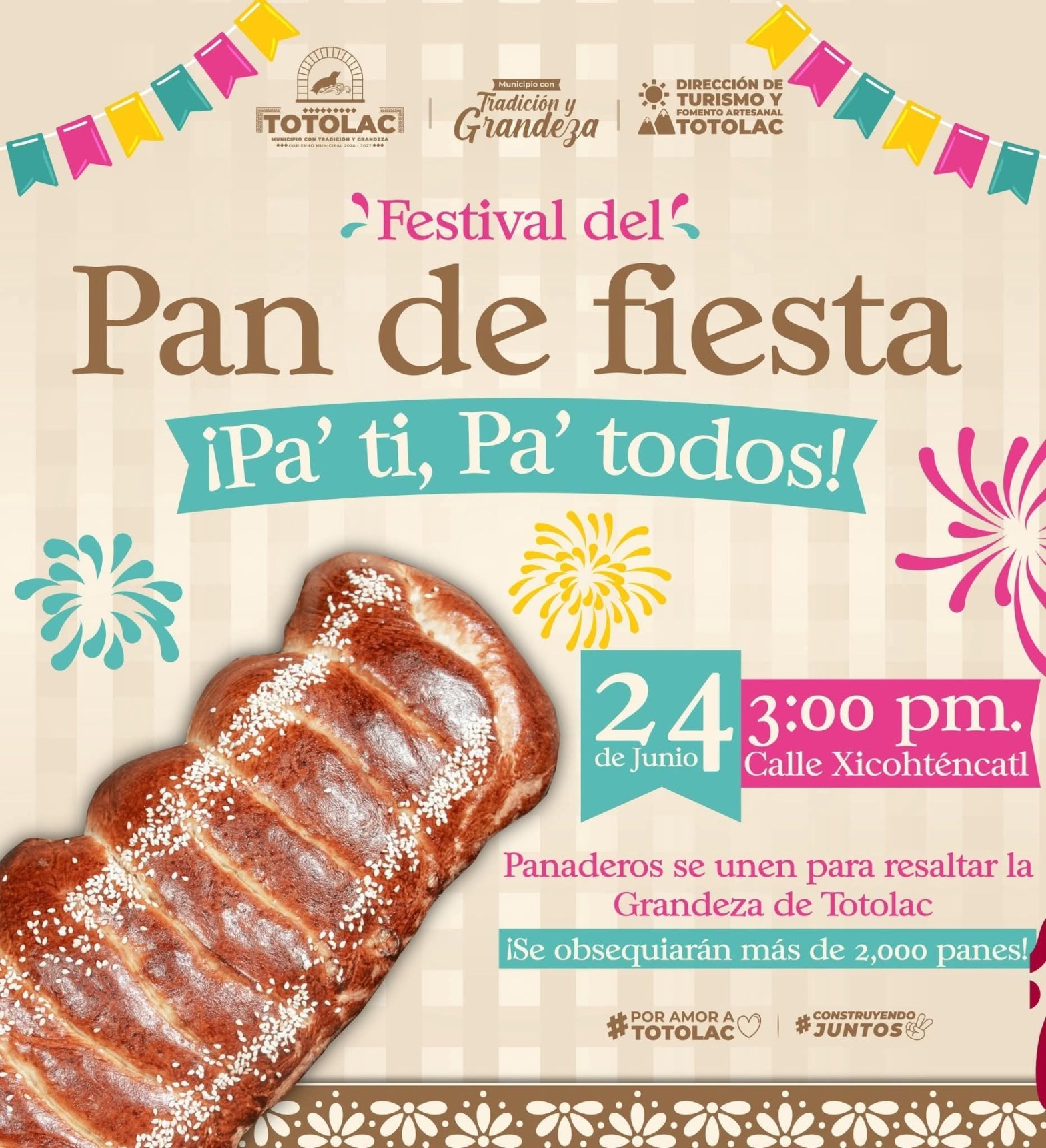 El Gobierno Municipal de Totolac 24-27 a través de la 𝗗𝗶𝗿𝗲𝗰𝗰𝗶ó𝗻 𝗱𝗲 𝗧𝘂𝗿𝗶𝘀𝗺𝗼 𝘆 𝗙𝗼𝗺𝗲𝗻𝘁𝗼 𝗔𝗿𝘁𝗲𝘀𝗮𝗻𝗮𝗹 en conjunto con panaderas/os del municipio hacen posible el «𝗙𝗲𝘀𝘁𝗶𝘃𝗮𝗹 𝗱𝗲𝗹 𝗣𝗮𝗻 𝗱𝗲 𝗙𝗶𝗲𝘀𝘁𝗮», en el que se obsequiarán 𝗺á𝘀 𝗱𝗲 𝟮𝟬𝟬𝟬 𝗽𝗮𝗻𝗲𝘀, con el objetivo de exaltar la Grandeza de Totolac y promover dicho producto como nuestro sello distintivo.