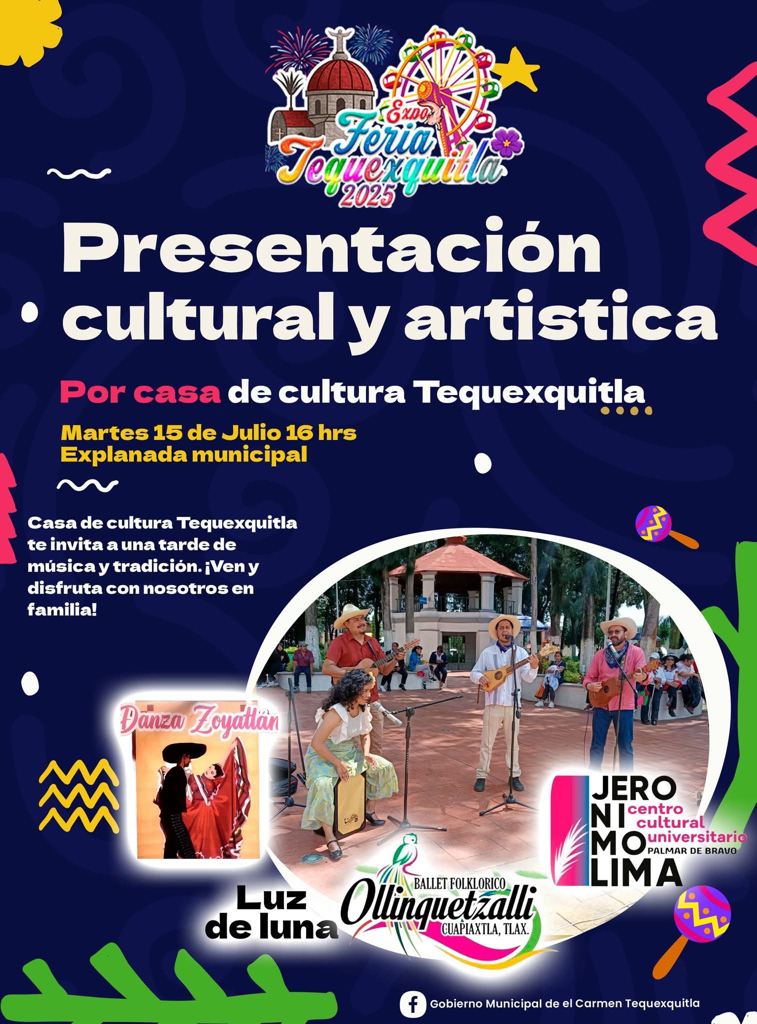 El Gobierno Municipal de El Carmen Tequexquitla te invita a la presentación cultural y artística de Casa de Cultura Tequexquitla, un evento que promete cautivar tus sentidos y llenarte de orgullo por nuestra rica herencia cultural.🎻🎹