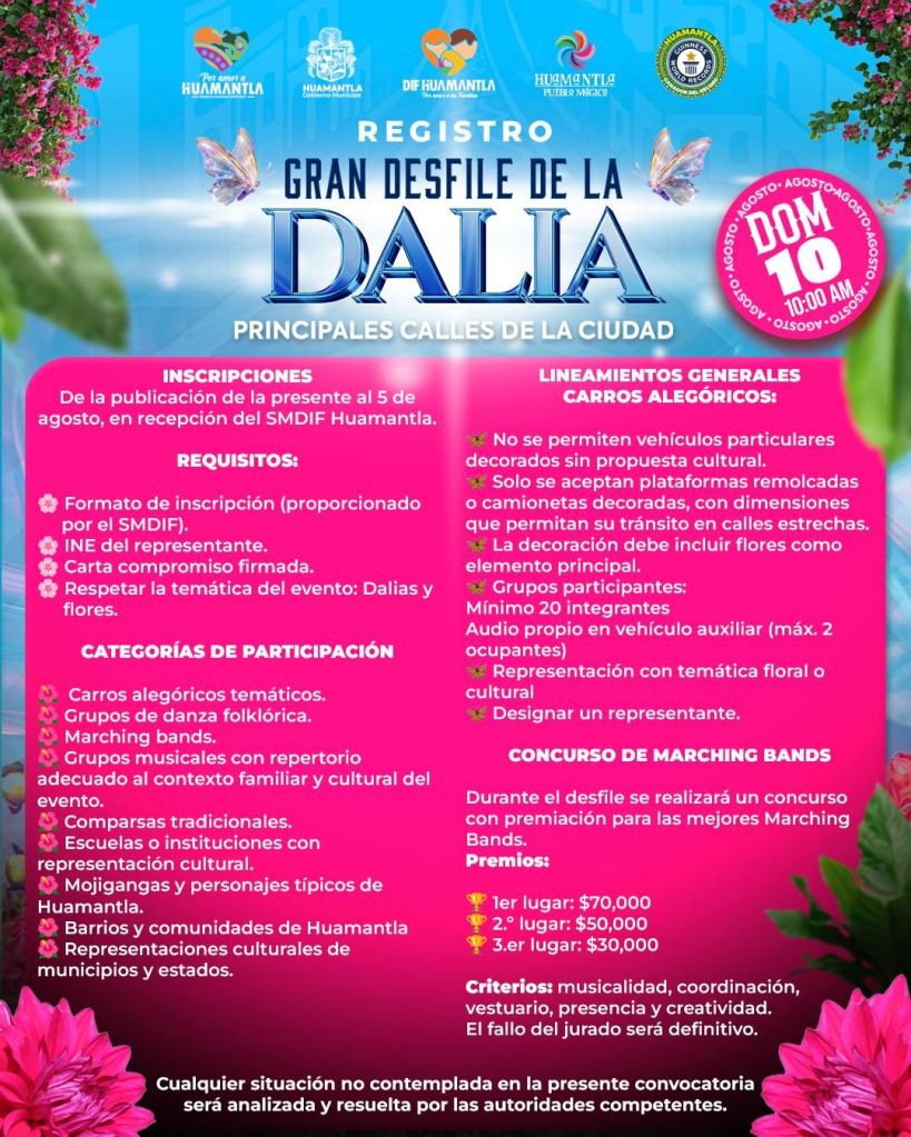 El Gobierno Municipal de Huamantla, que encabeza el presidente Salvador Santos Cedillo, convoca a instituciones educativas, organizaciones civiles, agrupaciones culturales, artísticas y a la ciudadanía en general, a participar en el tradicional Desfile de la Dalia 2025, uno de los eventos más emblemáticos de nuestra feria.