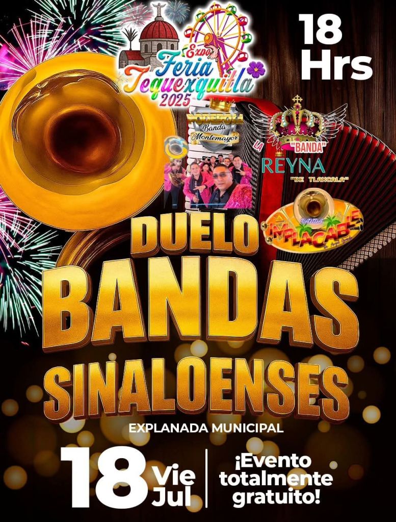 La Presidenta Araceli Martínez Cortez y su H. Ayuntamiento 2024-2027 te invitan al Duelo de Bandas Sinaloenses 🌟 en el marco de la Expo Feria Tequexquitla 2025 🎊.