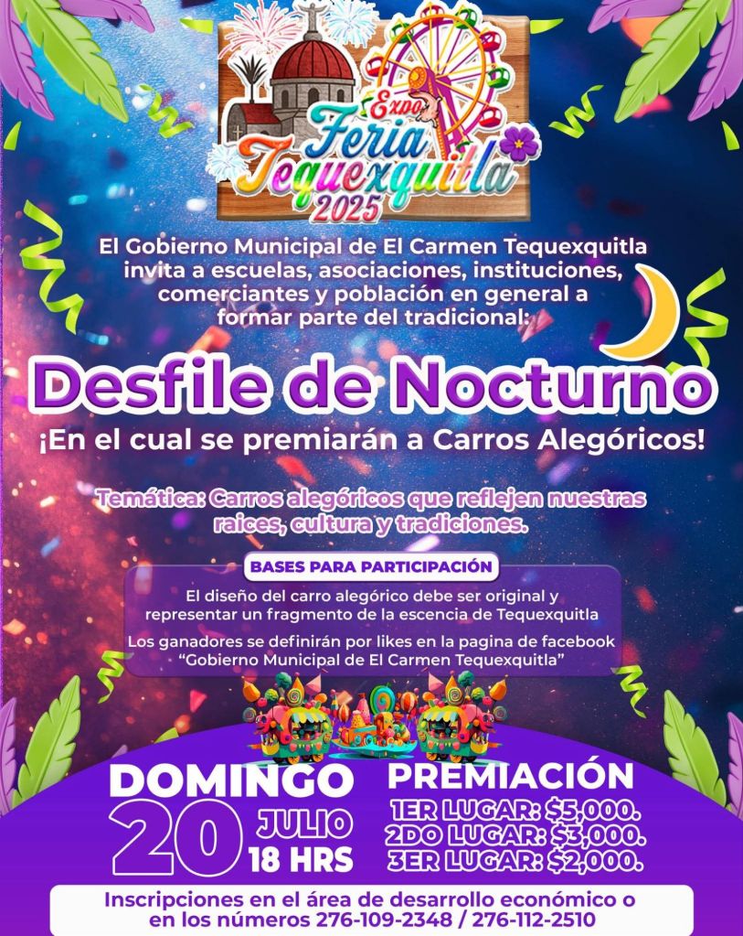 El Gobierno Municipal de El Carmen Tequexquitla te invita a participar en el gran desfile nocturno que se llevará a cabo el domingo 20 de julio a las 18 horas ⏰.