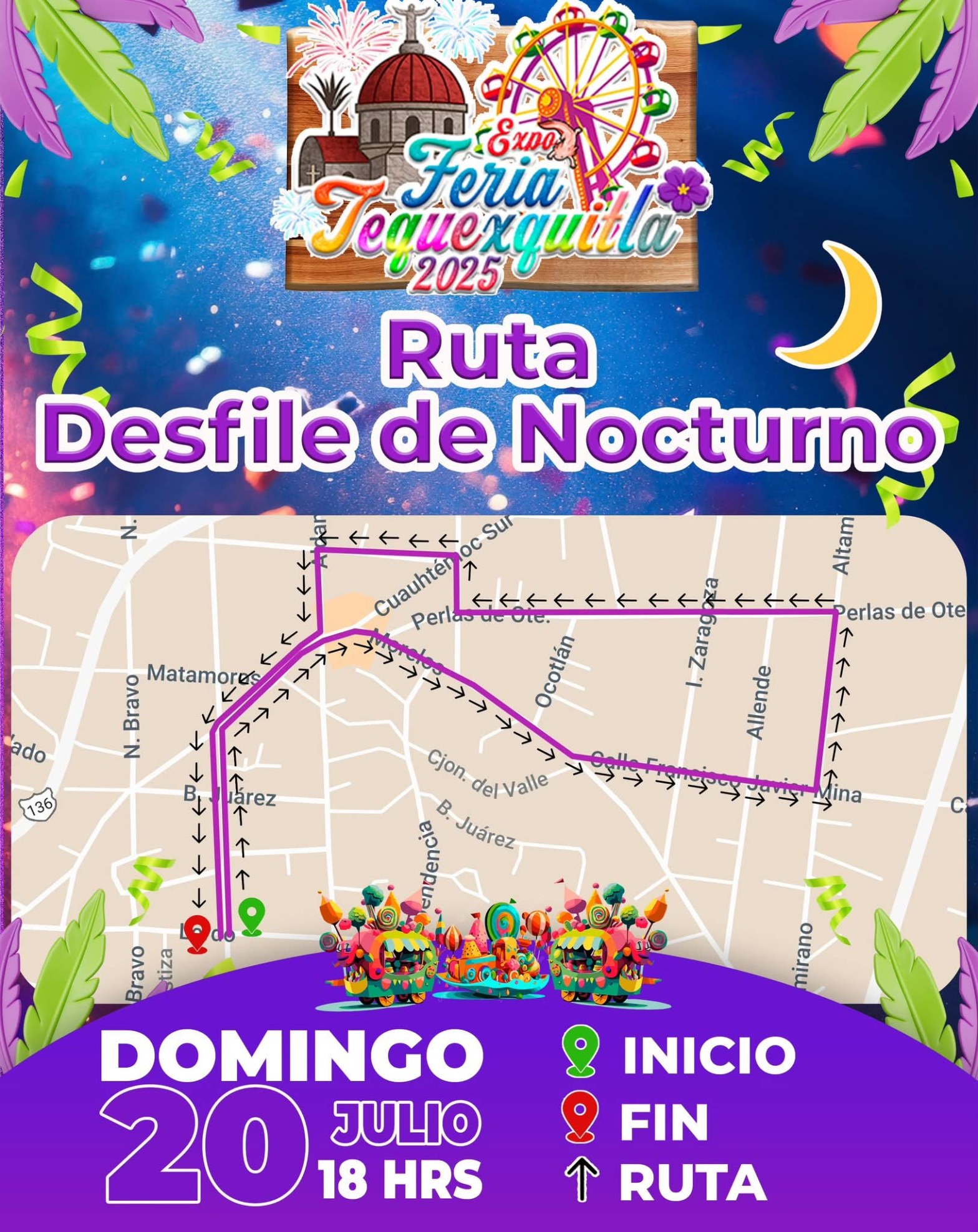Esta noche, el Desfile Nocturno iluminará las calles de Tequexquitla 🌃. A continuación, te presentamos la ruta del desfile.