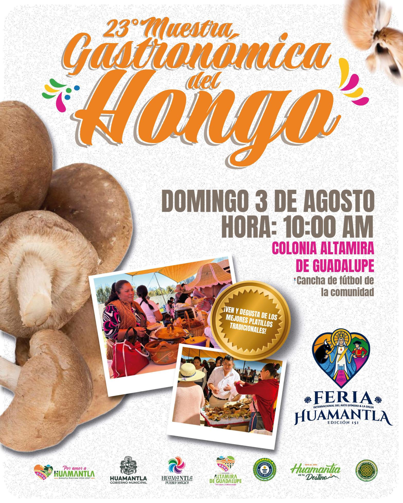 El Ayuntamiento de Huamantla invita a todos los amantes de la gastronomía y la cultura a la 23° “Muestra Gastronómica del Hongo», evento que se llevará a cabo el próximo domingo 03 de agosto a las 10:00 horas en la cancha de fútbol de la comunidad de Altamira de Guadalupe.