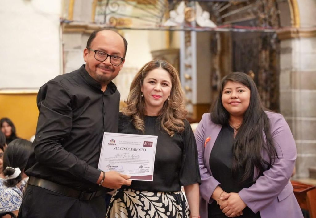 En nombre del presidente municipal Alfonso Sánchez García, la síndica Ivonne Hernández Blancas entregó un reconocimiento al maestro Xolocotzi, tras destacar su aportación al arte y la cultura desde Tlaxcala hacia todo el país.
