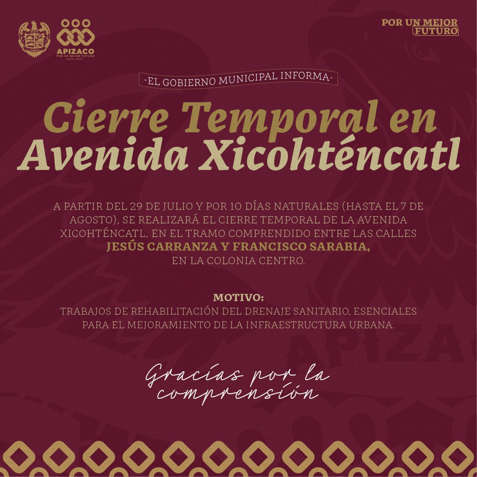 🚧 A partir del 29 de julio y durante 10 días naturales (hasta el 7 de agosto), se llevará a cabo el cierre temporal de la Avenida Xicohténcatl, en el tramo comprendido entre las calles Jesús Carranza y Francisco Sarabia, en la colonia Centro.