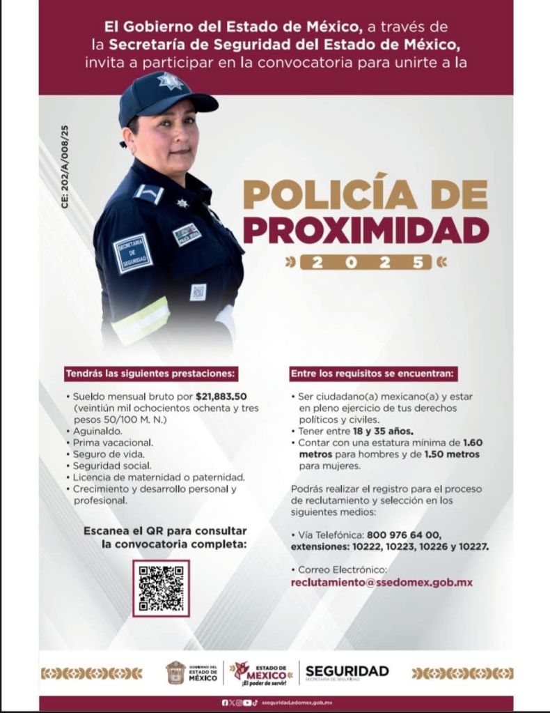 El Gobierno del Estado de México y la Secretaría de Seguridad te invitan a formar parte de la nueva generación de Policía de Proximidad.